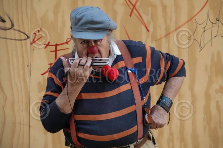 Un joven mimo y su pequeño descansan durante su jornada en las calles, en donde se ganan la vida ofreciendo un breve espectáculo a cambio de unas monedas.