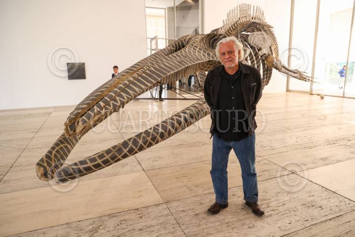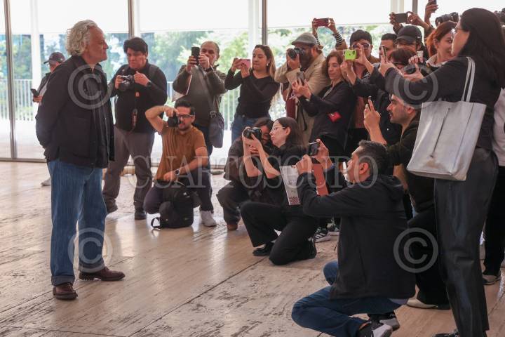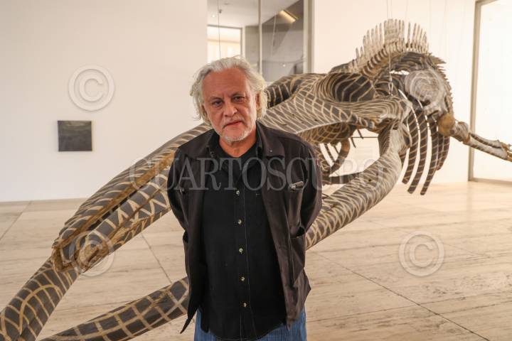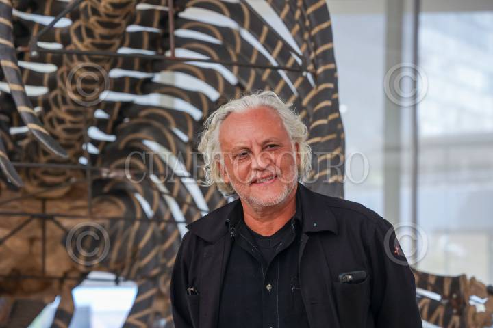CIUDAD DE MÉXICO, 28ENERO2025.- El artista plástico Gabriel Orozco mostro su nueva exposición "Gabriel Orozco: Politécnico Nacional", que esta albergada en el Museo Jumex. La exhibición explora temas clave en la práctica de Orozco, mostrando cómo ha desafiado constantemente lo que el arte puede ser y cómo se hace, además muestra múltiples técnicas y estrategias del artista que ha desarrollado a lo largo de una extensa carrera que comenzó a principios de la década de 1990. También preciso que que no esta hecha en orden cronológico, sino que explora la fisura entre su obra y el mundo, cuestionando donde acaba una y empieza otra. En la imagen posa con su obra Dark Wave (2006). FOTO: MOISÉS PABLO/CUARTOSCURO.COM
