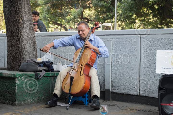 CIUDAD DE MÉXICO, 25ABRIL2017.- Un vilonchelista se ubica a las afueras de metro Etiopía para interpretar canciones a cambio de algunas monedas. El auge de los músicos urbanos, en la zona centro de la ciudad, obligó a las autoridades a establecer lugares y horarios para los artistas. FOTO: SELENE PACHECO /CUARTOSCURO.COM