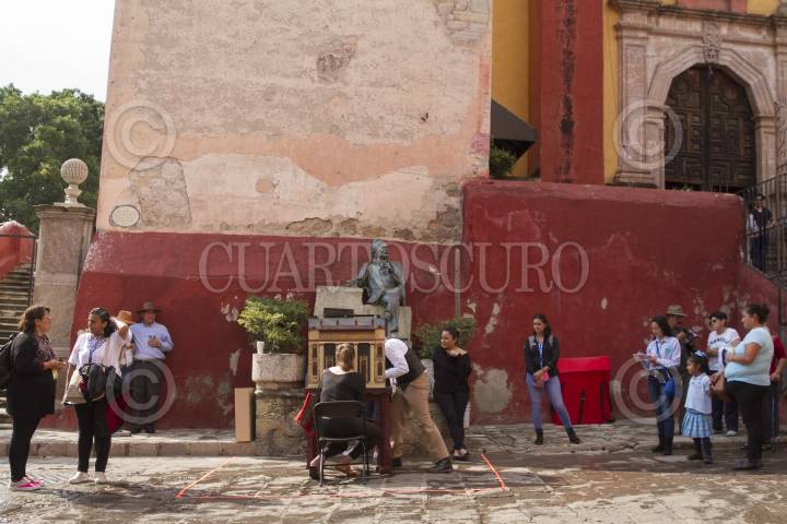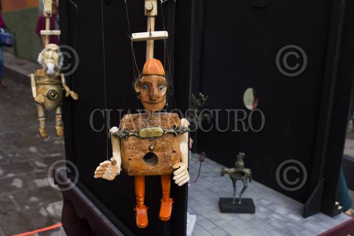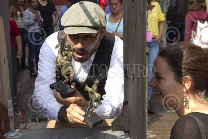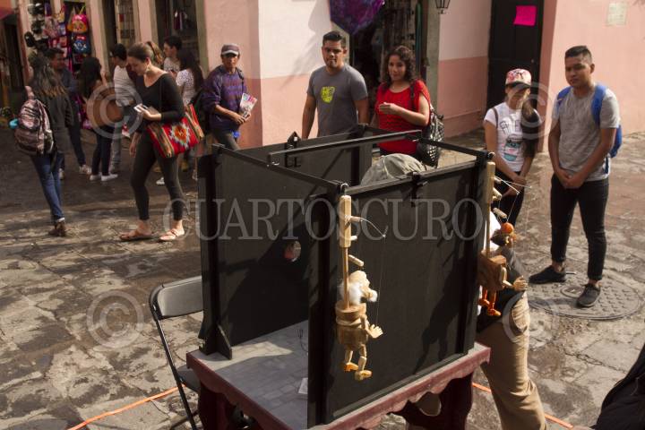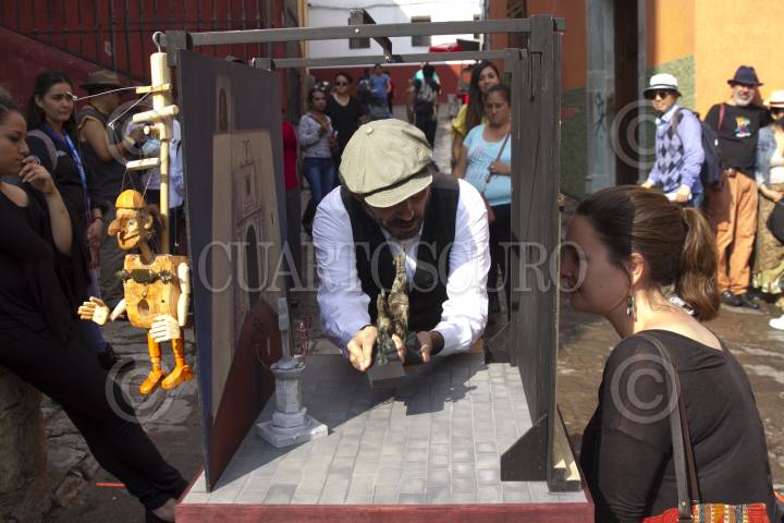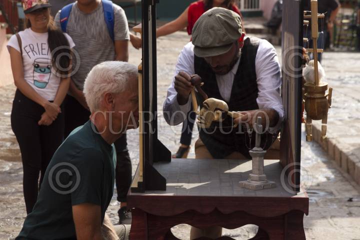GUANAJUATO, GUANAJUATO, 20OCTUBRE2017.- Teatreros cuentan breves historias a través de mirillas; ayudados de marionetas, dibujos de cartón, pequeños escenarios y una silla, por que estos montajes están pensados para que sean observados por una persona. Los artistas abordan "El Quijote de la Mancha" en breves relatos que pretenden dejar datos muy precisos de estas joyas de la literatura y quizás de una forma indirecta invitar a conocer la obra en sí. FOTO: MOISÉS PABLO /CUARTOSCURO.COM