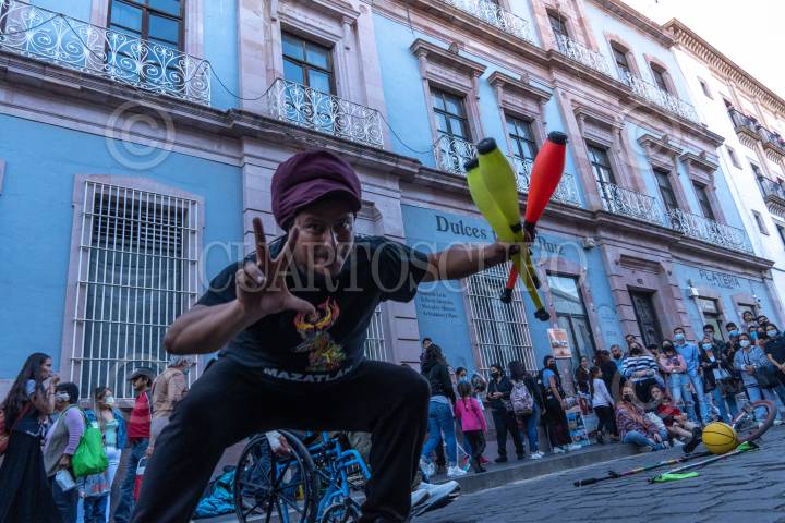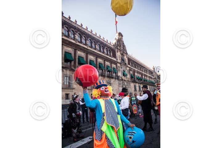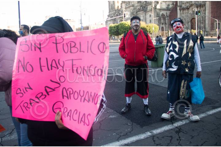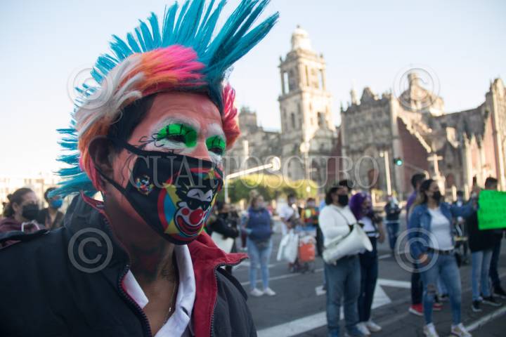 Cirqueros, payasos y artistas callejeros se manifestaron, frente a Palacio Nacional, en demanda de apoyos economicos debido a la falta de trabajo por la pandemia de Covid 19.