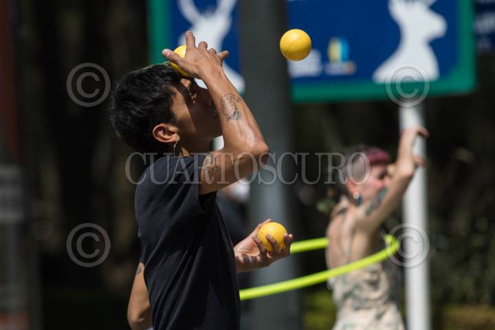 Jóvenes malabaristas se ganan la vida en avenida Municipio Libre.