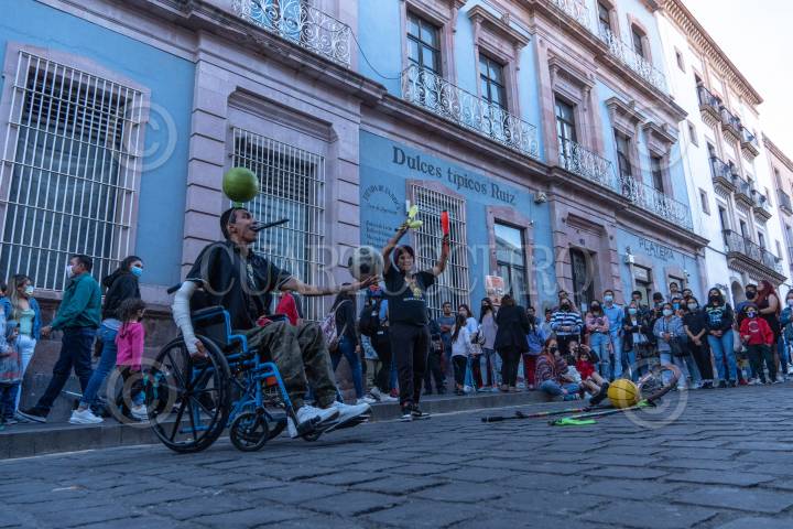 Artistas callejeros ofrecen su espectáculo a los asistentes del Festival Cultural Zacatecas 2022.