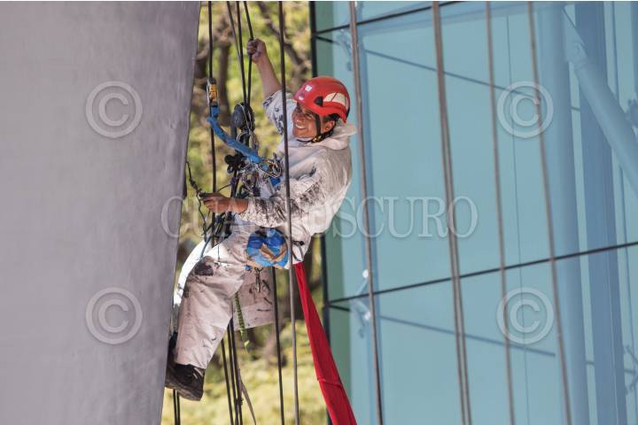Un obrero colgado de las alturas pinta una de las columnas de Torre Bancomer.