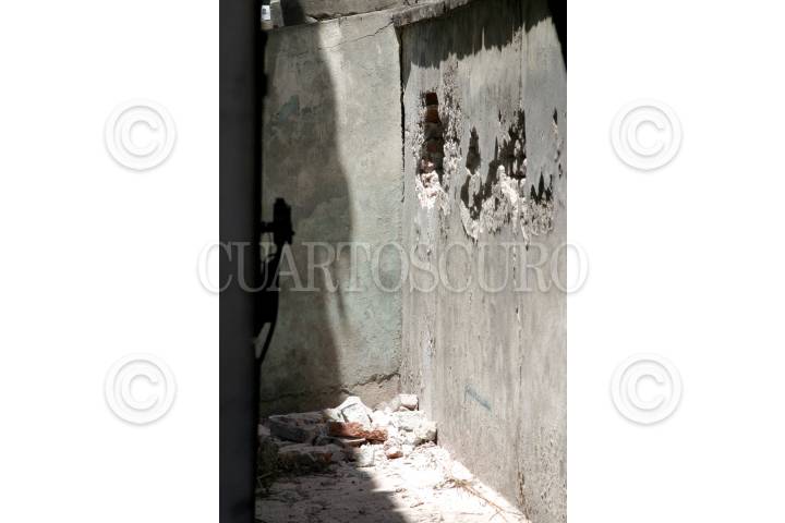 MÉXICO, D.F., 02ABRIL2008.- En las calles de Montevideo y Talapa en la colonia San Tepeyac Insurgentes, durante la noche varios sujetos intentaron llegar a la bodega de una sucursal de Bancomer, los asaltantes intentaron abrir un boquete por a parte de trasera en donde se ubica una casa abandonada y un salón de fiestas, aunque les falló el calculo y solo lograron llegar a los baños por lo que se dieron a la fuga. FOTO. PEDRO MARRUFO/CUARTOSCURO.COM