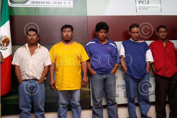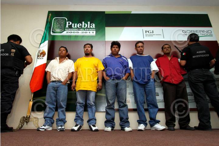 PUEBLA, PUEBLA, 06MARZO2009.- Cinco presuntos integrantes de una banda delictiva, provenientes del vecino estado de Morelos, fueron detenidos por los asaltos cometidos a 20 sucursales de la institución bancaria HSBC, ubicadas en este estado. La policía judicial logró su captura cuando los involucrados se disponían a realizar el atraco número veintiuno. FOTO: JAVIER PALACIOS/CUARTOSCURO.COM