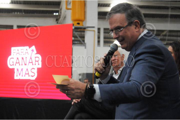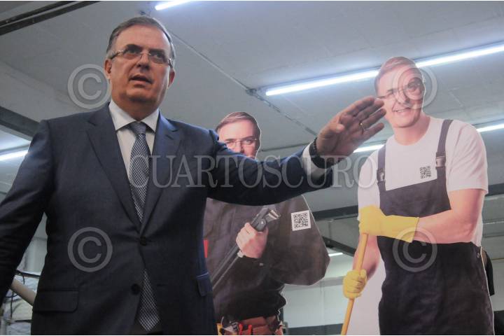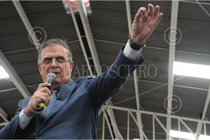 Marcelo Ebrard llega a la conferencia en Iztapalapa.