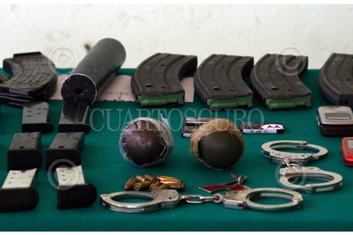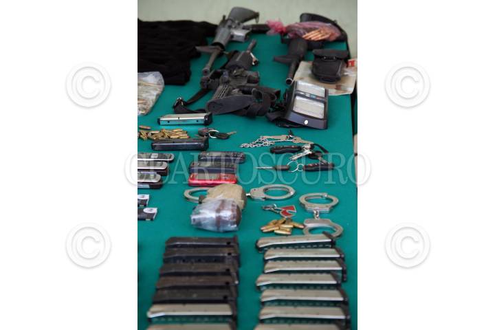 VILLAHERMOSA, TABASCO, 31AGOSTO2009.- En las instalaciones de la Policía Ministerial del estado, presentaron el armamento asegurado que llevaban consigo los presuntos “zetas” en la balacera que se registró la noche de ayer. Ahí mismo Orlando May Zaragoza, director de dicha dependencia, dejo entre ver que no le tiembla la mano, ni le tiene miedo a este brazo armado ya que acabara con ellos; aprovechando los reflectores de la prensa. FOTO: MARCO POLO GUZMÁN HERNÁNDEZ/CUARTOSCURO.COM
