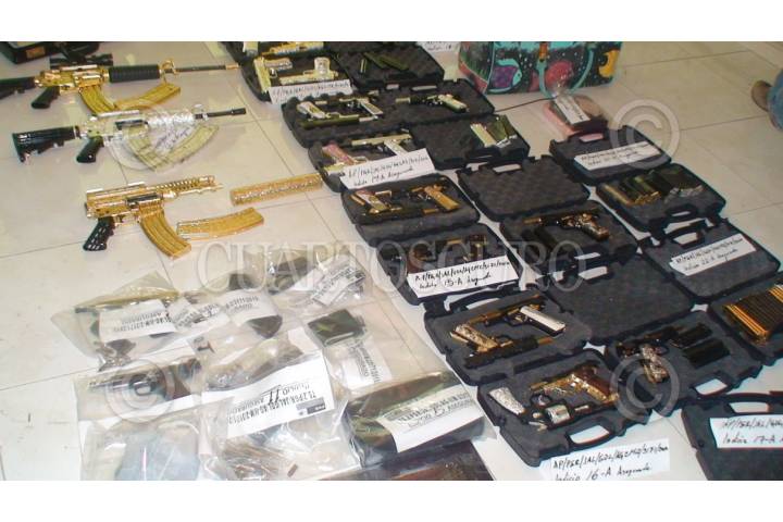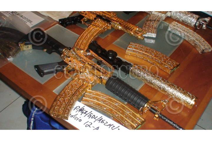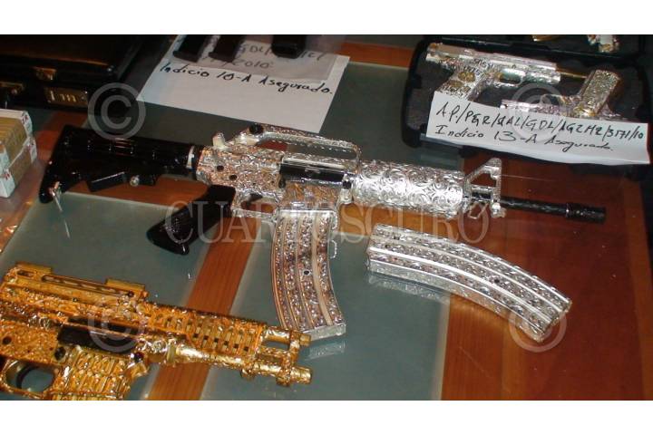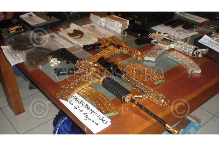 GUADALAJARA, JALISCO, 03MAYO2010.- Durante un operativo realizado en una finca de la colonia Jardines de Guadalupe del municipio de Zapopan, Jalisco; elementos de la Secretaría de la Defensa Nacional (Sedena) y de la Procuraduría General de la República (PGR), aseguraron un arsenal de armas largas chapeadas en oro y plata con otras incrustaciones de brillantes, rubíes y esmeraldas, que presuntamente pertenecían al narcotraficante Orlando Nava Valencia, conocido como "Lobo Valencia". FOTO: ESPECIAL/CUARTOSCURO.COM