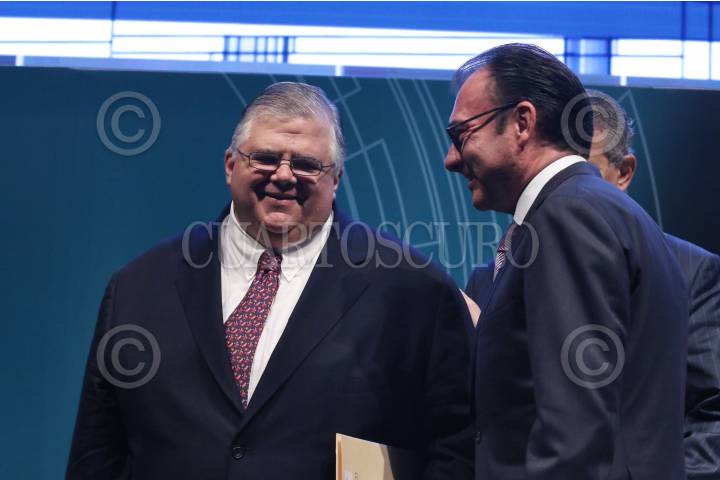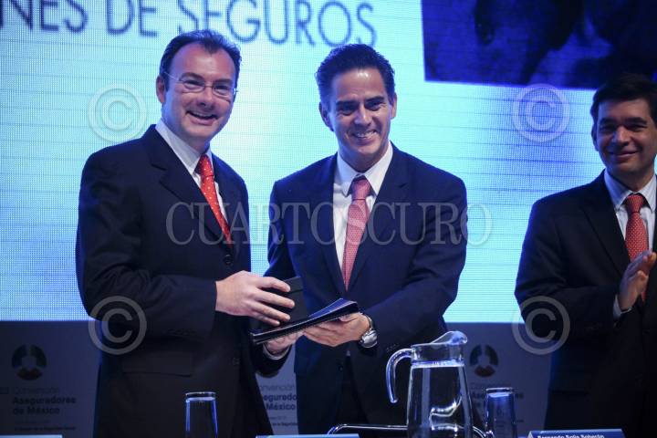 MÉXICO, D.F., 07MAYO2013.- Luis Videgaray Caso, Secretario de Hacienda y Crédito Público; y Fernando Solis Soberón, Presidente de la Asociación Mexicana de Instituciones de Seguros; durante la 23 Convención de Aseguradores de México realizado en la Expo Banamex. FOTO: ADOLFO VALTIERRA /CUARTOSCURO.COM