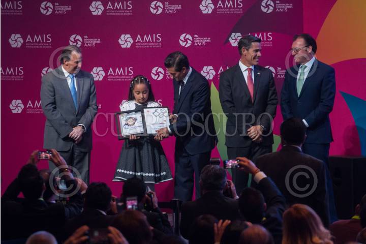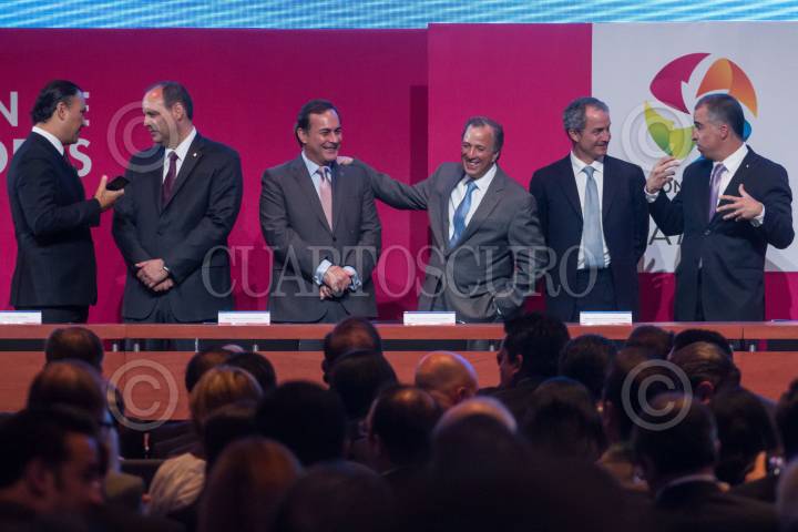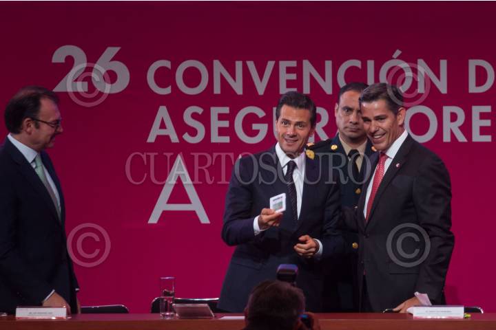 CIUDAD DE MÉXICO, 20ABRIL2016.- José Antonio Meade, titular de Sedesol, el presidente Enrique Peña Nieto, Luis Videgaray, secretario de Hacienda, y Mario Vela Berrondo, presidente de la Asociación Mexicana de Instituciones de Seguros, durante la 26 Convención de Aseguradores de México, en el Centro Banamex. FOTO: ISAAC ESQUIVEL /CUARTOSCURO.COM