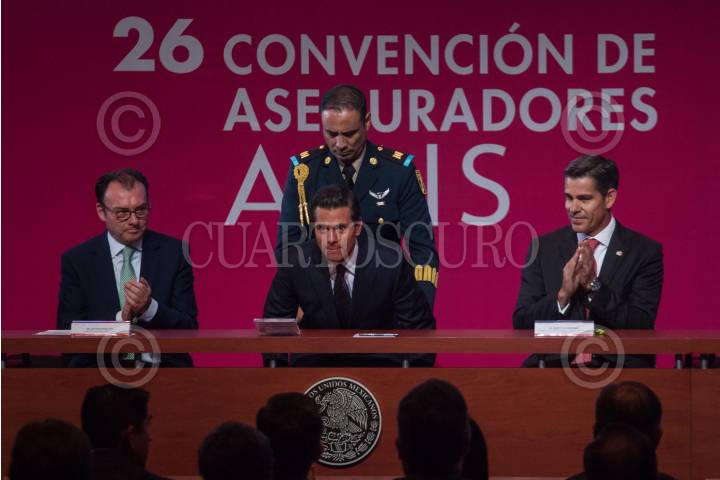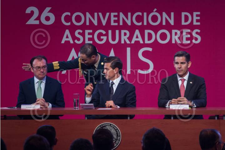CIUDAD DE MÉXICO, 20ABRIL2016.- Luis Videgaray, secretario de Hacienda, el presidente Enrique Peña Nieto y Mario Vela Berrondo, presidente de la Asociación Mexicana de Instituciones de Seguros, durante la 26 Convención de Aseguradores de México, en el Centro Banamex. FOTO: ISAAC ESQUIVEL /CUARTOSCURO.COM