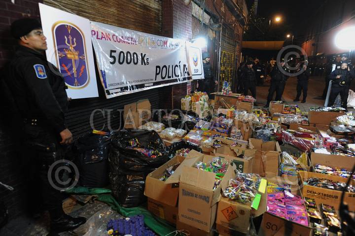 CIUDAD DE MÉXICO., 12SEPTIEMBRE2107.- Mediante un operativo del grupo de fuerza de tarea de la SSP y el INVEA, se logró el decomiso de aproximadamente 5000 kilos de pirotecnia, que mantenían resguardada en una bodega ubicada en la calle 2ª de Roldan marcada con el número 22, en la colonia Centro, mismo que fue clausurado. El material asegurado fue transportado a las instalaciones de fuerza de tarea, en la calle de Piraña en la colonia Del Mar en Tláhuac, para su destrucción. FOTO: LUIS CARBAYO /CUARTOSCURO.COM