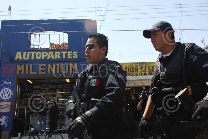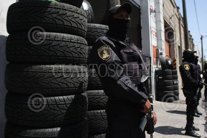 PUEBLA, PUEBLA, 09MARZO2011.- Cerca de 500 elementos de la policía estatal, AFI, policía metropolitana y policía judicial, realizaron un operativo en la zona de autopartes de calle 46 poniente para detectar mercancía apócrifa. En el lugar el titular de seguridad pública en el estado, Ardelio Vargas Fosado dirigió a los efectivos que aseguraron 20 toneladas de autopartes, 30 vehículos y 46 personas detenidas por presunto manejo ilícito de la mercancía. FOTO: FRANCISCO GUASCO/CUARTOSCURO.COM