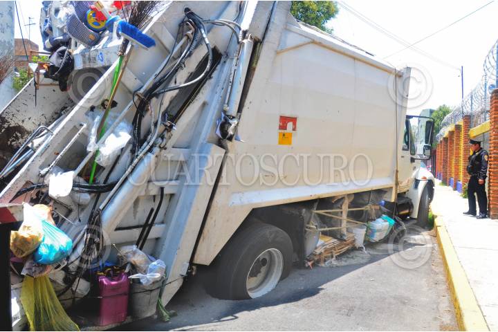 MÉXICO, D.F., 16AGOSTO2009.- Un camión recolector de basura se le hundió la llanta trasera al cuando salía de un panteón ubicado en avenida del Rastro y División del Norte en la colonia Rosedal perímetro de la delegación Coyoacan. Al lugar arribo personal de Protección Civil para valorar el hoyo que se creo debido a un asentamiento de tierra. FOTO: LUIS CARBAYO/CUARTOSCURO.COM