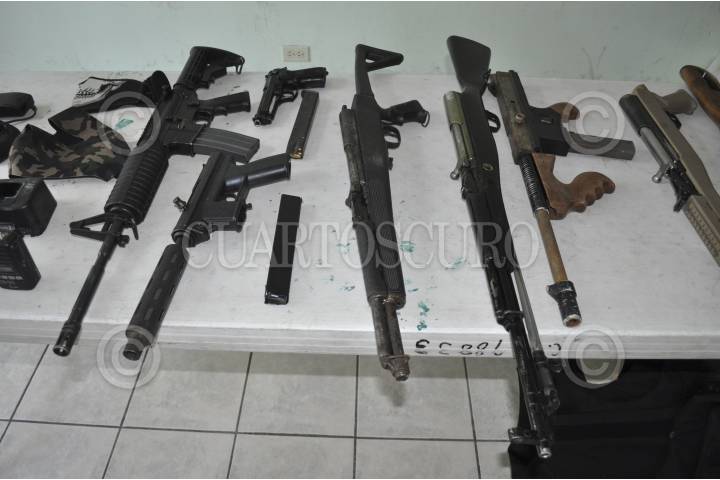 CIUDAD JUÁREZ, CHIHUAHUA, 03ABRIL2013.- Con arsenal y vehículos robados, policías municipal arrestaron en Juárez a cinco presuntos sicarios a quienes relacionan con en el hombre decapitado que dejaron el fin de semana en Pradera Dorada. En tres intervenciones, agentes de la Policía en Juárez lograron arrestar a cinco presuntos sicarios, dio a conocer el vocero de la corporación, Adrián Sánchez. En la primera detuvieron a tres de ellos, luego de que en patrullaje los agentes detectaran arma a bordo de camioneta que arreglaban en las calles Helio y Amapola de la colonia Altavista. Tras este arresto lograron la detención de otros dos sujetos. A los presuntos sicarios los identificaron como Luis Alejandro Chanes Olivas de 23 años de edad, Héctor Aarón Carlos Chaparro de 20, Omar Ored Del Toro Vega de 36, Roberto Palacios Lozoya de 30 y Víctor Manuel Olmos Castañeda de 22. Les aseguraron 19 armas largas, entre ‘cuernos de chivo y R15, seis armas cortas, dos mil cartuchos útiles, 31 cargadores para diferentes armas, siete radios de comunicación, nueve chalecos antibalas y cuatro vehículos con reporte de robo. FOTO: NACHO RUÍZ /CUARTOSCURO.COM