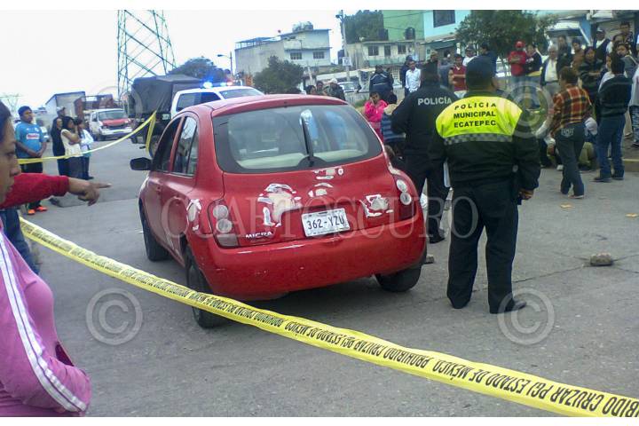 ECATEPEC, ESTADO DE MÉXICO, 12OCTUBRE2014.- Tres hombres fueron asesinados cuando viajaban en un auto tipo Micra color rojo, el cual fue interceptado por pistoleros que abrieron fuego en contra de los tripulantes del vehículo en la Colonia Ciudad Cuauhtémoc. FOTO: IVY CASTILLO /CUARTOSCURO.COM