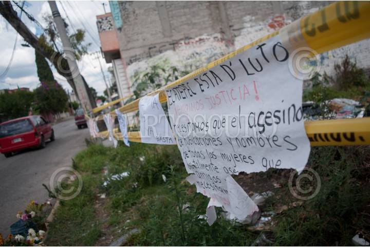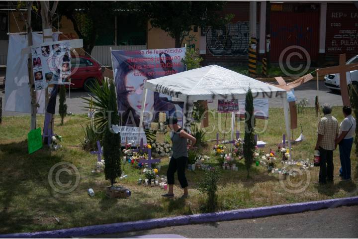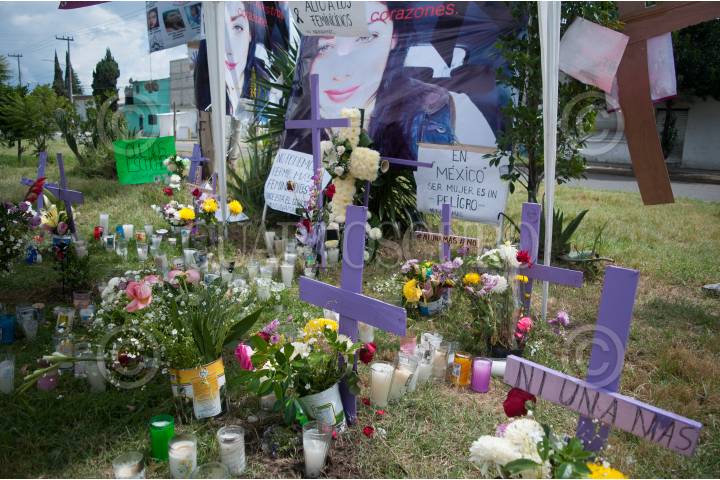 ECATEPEC, ESTADO DE MÉXICO, 14OCTUBRE2018.- Cruces y pancartas para exigir justicia y castigo a los responsbles por varios asesinatos de mujeres en Ecatepec han sido colocadas en calles de la colonia Jardines de Morelos luego de la detención de una pareja que se declaró culpable por el asesinato de más de 10 mujeres en su domicilio ubicado en la calle Playa Tijuana. Según el Observatorio Ciudadano Nacional del Feminicidio, en el Estado de México se han cometido más de 1400 feminicidios entre 2014 y 2017, siendo Ecatepec el municipio con más delitos. En la imagen, una ofrenda que fue puesta durante una marcha realizada la semana pasada en el camellón de la avenida Nicolas Bravo. FOTO: DIEGO SIMÓN SÁNCHEZ /CUARTOSCURO.COM