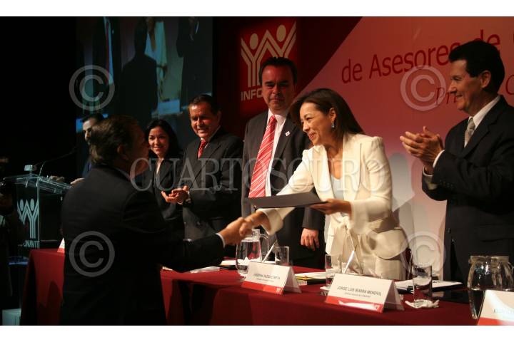 MÉXICO, D.F., 20MARZO2007.- La secretaria de Educación, Josefina Vázquez Mota, y el director general del INFONAVIT, Víctor Manuel Borras, durante la entrega de certificados a asesores inmobiliarios. FOTO: ISAAC ESQUIVEL/CUARTOSCURO.COM