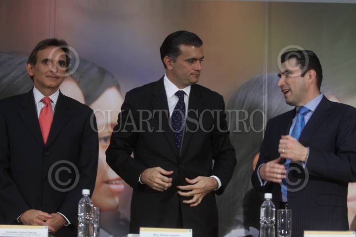MÉXICO, D.F., 08JULIO2010.- Carlos Pascual, embajador norteamericano, Alonso Lujambio, Secretario de Educación Pública y Fernado González, subsecretario de educación básica, durante la ceremonia de entrega de becas para maestros y asesores técnicos pedagógicos de educación indígena y para jóvenes de comunidades indígenas y rurales, en el salón Hispanoamericanos del edificio de la SEP. FOTO: MOISÉS PABLO/CUARTOSCURO.COM