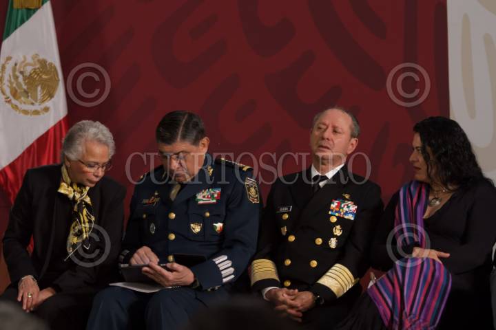 CIUDAD DE MÉXICO, 12NOVIEMBRE2019.- Olga Sánchez Cordero Dávila, secretaria de Gobernación; Luis Cresencio Sandoval González, secretario de la Defensa Nacional; José Rafael Ojeda Durán; secretario de la Marina y Alejandra Frausto Guerrero, secretaria de Cultura, durante la conferencia matutina diaria para responder preguntas a los medios de comunicación en el Palacio Nacional. FOTO: ANDREA MURCIA /CUARTOSCURO.COM