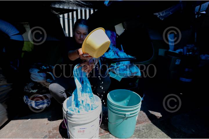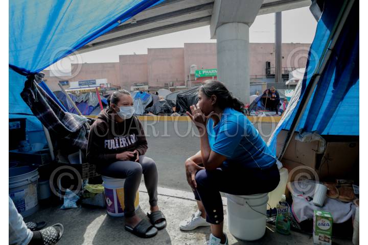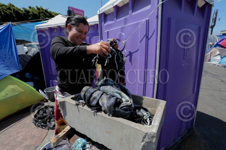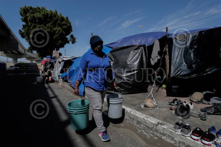 Migrantes que mantienen un campamento en la garita internacional de "El Chaparral" comparten una sola llave de agua para cocinar, asear y bañarse en espera de la resolución a su situación migratoria.