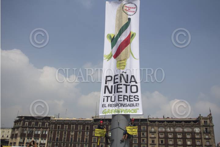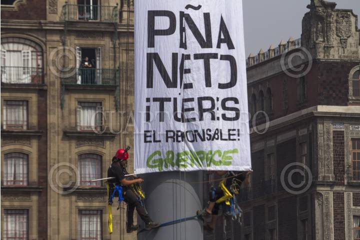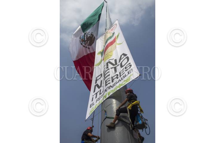 MÉXICO, D.F., 04JULIO2013.- Activistas de Greenpeace, escalaron el Asta Bandera del Zócalo Capitalino para colocar una manta exigiendo con la leyenda "Peña Nieto tu eres el responsable" al referirse a la siembra de maíz transgenico en tierras Mexicanas. FOTO: ENRIQUE ORDÓÑEZ /CUARTOSCURO.COM