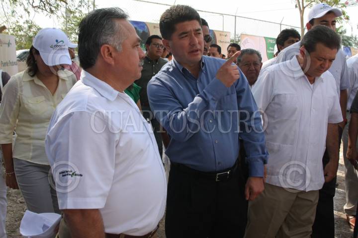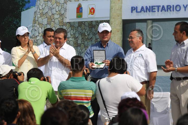 CHETUMAL, QUINTANA ROO, 02ABRIL2011.- Felix Arturo González Canto, gobernador del estado acudió a tempranas horas a poner la primera piedra de la edificación del Planetario Observatorio con Cosmovisión Maya "Yook´Ol - Kaab". A pocos horas que termine su mandato constitucional, el mandatario acudió en compañía de Andrés Florentino Ruiz Morcillo, edil de Othon Pompeyo Blanco y Jose Antonio Hoy Manzanilla, director del COQCYT; ahí recibió una medalla al mérito por su aportación a la ciencia e investigación. FOTO: MARCO POLO GUZMÁN HERNÁNDEZ/CUARTOSCURO.COM
