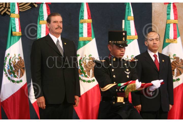 MÉXICO, DF. 01 DE DICCIEMBRE 2006.- Felipe Calderon Hinojosa durante la ceremonia donde asumio el cargo como presidente, acompañado de Vicente Fox. FOTO:PRESIDENCIA/ CUARTOSCURO.COM