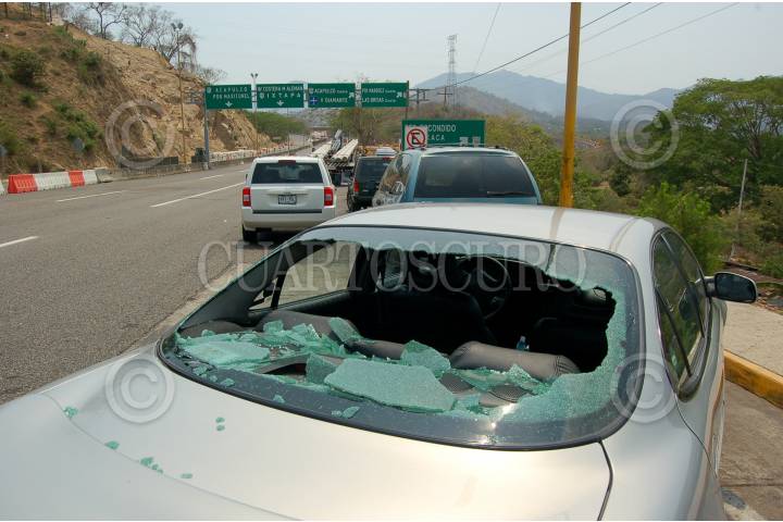 ACAPULCO, GUERRERO, 29ABRIL2009.- Turistas procedentes del Distrito Federal, Chilpancingo y Taxco por la Autopista del sol, a bordo de vehículos particulares y dos camiones de transporte publico fueron agredidos a pedradas por desconocidos cuando se dirigían a este puerto a 15 kilómetros de la caseta de cobro la Venta, dejando a tres personas lesionadas por los vidrios de la unidades informaron los quejosos. Las causas de este hecho se desconocen. FOTO: MARINO D. VALDEZ/CUARTOSCURO.COM