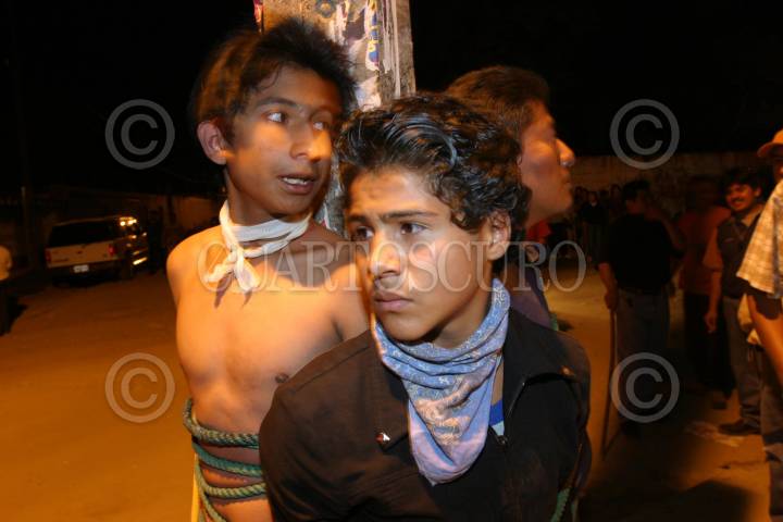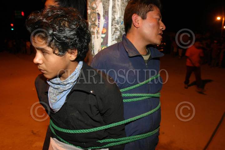 OAXACA, OAXACA, 02OCTUBRE2006.- Integrantes de la APPO fueron rescatados por sus compañeros luego de ser retenidos y golpeados por supuestos grupos priistas de las colonia Pueblo Nuevo en el paraje conocido como Brenamiel. En la imagen los individuos aparecen atados a un poste. FOTO: MOISÉS PABLO/CUARTOSCURO.COM