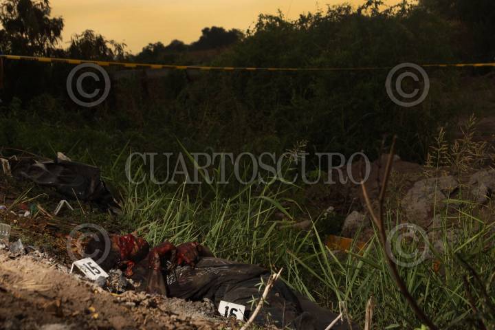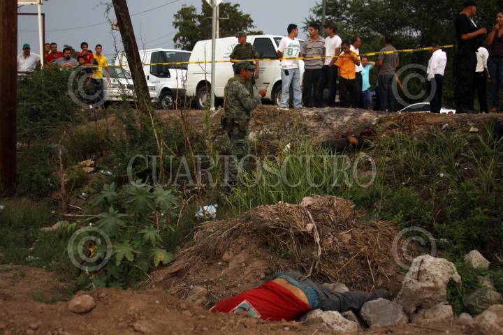 CULIACAN, SINALOA, 16JULIO2011.- Dos cuerpos sin vida fueron encontrados a un costado de la carretera Culiacán-Altata a unos metros del oxxo el limoncito, las victimas fueron identificadas como Juan Manuel Rivera Flores y Pedro Domínguez Aguilar los cuales estaban esposados y encintados de la cara, como evidencia se localizo 29 casquillos para armas largas, 13 para AR-15 y 16 para AK-47. Una vez concluidas las diligencias, los cuerpos fueron retirados del lugar. FOTO: RASHIDE FRIAS/CUARTOSCURO.COM