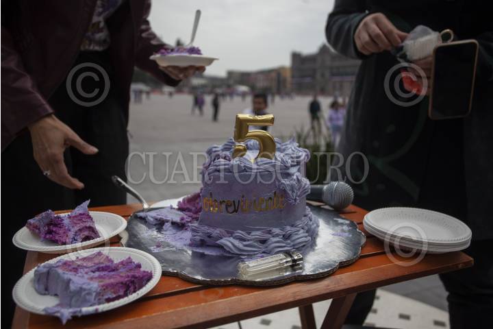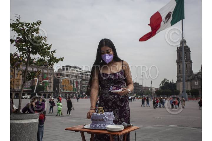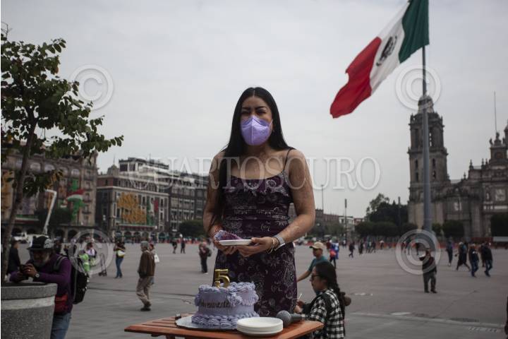 CIUDAD DE MÉXICO, 09SEPTIEMBRE2024.- María Elena Ríos, saxofonista comunicóloga la cual el 9 de septiembre de 2019, dos hombres le arrojaron una cubeta con ácido en el cuerpo por ordenes supuestamente de su expareja el exdiputado priista Juan Antonio Vera Carrizal y que estuvo a punto de ser liberado hace dos semanas por orden del juez José Gabriel Montaño. Ofreció conferencia de prensa en la plancha del Zócalo donde también llevó un pastel como símbolo de la lucha y resistencia que sigue llevando a 5 años. FOTO: ANDREA MURCIA /CUARTOSCURO.COM