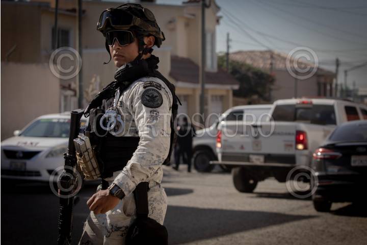 TIJUANA, BAJA CALIFORNIA 19OCTUBRE2023.-Elemento de la Guardia Nacional resguardando la escena, mientras procesa la evidencia del lugar donde la oficial es asesinada. Una mujer agente de la Secretaría de Seguridad Estatal Ciudadana, fue atacada a balazos a las afueras de su vivienda, cuando se encontraba a bordo de su vehículo. Paramédicos de la Cruz Roja, arribaron al lugar para brindar atención médica a la mujer, quien ya no contaba con signos vitales. De acuerdo a información extraoficial, la agente iba acompañada de su hija, debido a que la iba a llevar a la escuela, cuando fue el ataque, sin embargo la menor resultó ilesa. La Fiscalía General del Estado y Servicios Periciales, realizaron el procesamiento de la escena encontrando varios impactos de bala en el vehículo Ford, Focus en el que iba abordó. En una cámara de vigilancia, las autoridades obtuvieron las imágenes del vehículo tipo Buik Regal, mismo que fue localizado a unas cuadras del lugar presuntamente con armas al interior. FOTO: OMAR MARTÍNEZ / CUARTOSCURO.COM