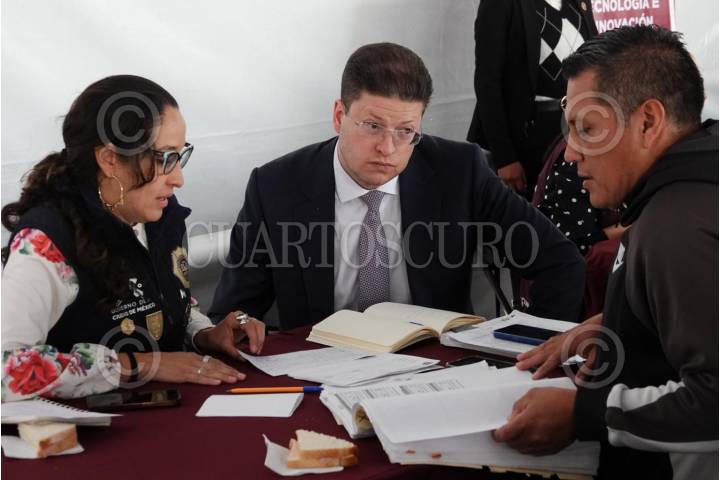 CIUDAD DE MÉXICO, 17DICIEMBRE2024.- Pablo Vázquez, secretario de Seguridad Ciudadana, acudió al módulo de dicha dependencia instalado en el Zócalo capitalino para atender las audiencias de la ciudadanía.