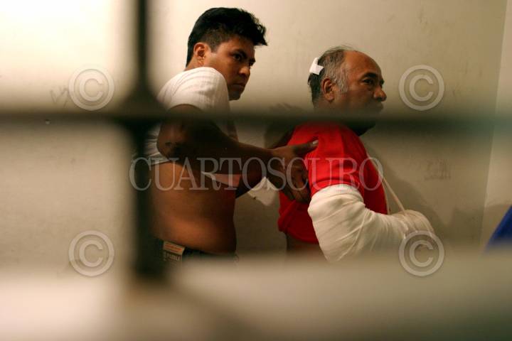 ALMOLOYA de JUAREZ, EDOMEX, 10MAYO2006.- Los detenidos de la toma de Atenco, fueron presentados en la rejilla de los juzgados del penal de Santiaguito, en donde se les notificó su situación juridica. A una parte se les dejo en libertad mientras que otros se les dicto el auto de formal prisión. En la imagen Héctor Galindo Cochicoa izq., integrante del Frente de Pueblos po la Defensa de la Tierra y otro detenido enseñeron parte de sus heridas causadas por los policias durante el enfrentamiento. FOTO: Moisés Pablo/CUARTOSCURO.COM
