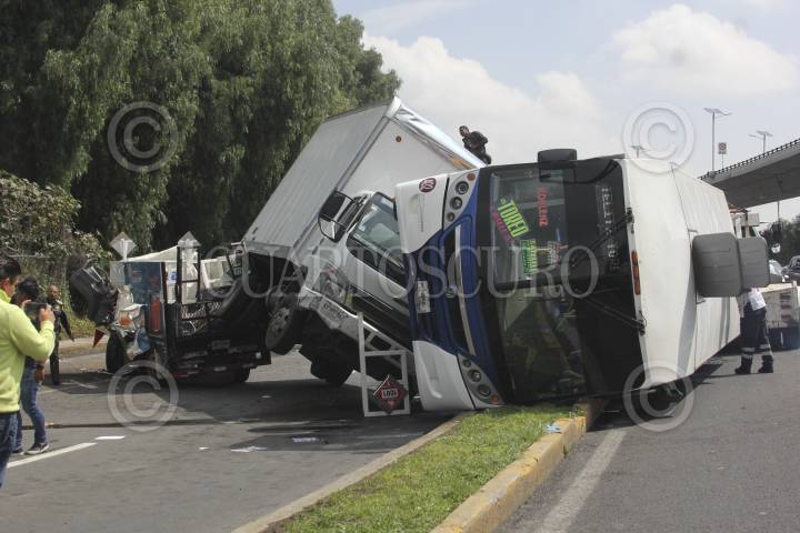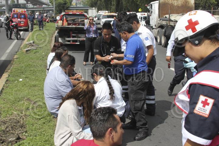 TLALNEPANTLA, ESTADO DE MÉXICO, 27JUNIO2016.- Diez personas resultaron lesionadas al registrarse un choque múltiple provocado por un trailer que circulaba sobre el Periférico Norte con dirección a la Ciudad de México, a la altura de Valle Dorado, un hombre termino prensado dentro de una camioneta, varios pasajeros que viajaban en un camión del transporte público fueron atendidos. FOTO: ARMANDO MONROY /CUARTOSCURO.COM