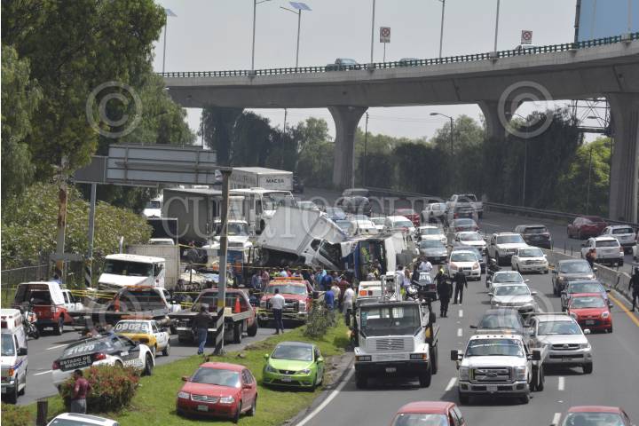 TLALNEPANTLA, ESTADO DE MÉXICO, 27JUNIO2016.- Diez personas resultaron lesionadas al registrarse un choque múltiple provocado por un trailer que circulaba sobre el Periférico Norte con dirección a la Ciudad de México, a la altura de Valle Dorado, un hombre termino prensado dentro de una camioneta, varios pasajeros que viajaban en un camión del transporte público fueron atendidos. FOTO: DIEGO REYES /CUARTOSCURO.COM