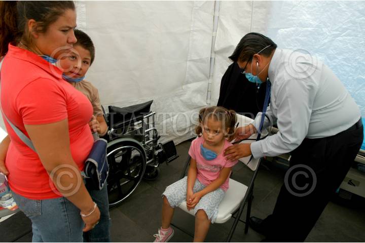 MÉXICO, D.F., 30ABRIL2009.- Una mujer con su hijo son atendidos por médicos dentro de un modulo de salud en donde se atiende a personas con síntomas del virus de la influencia humana AH1N1. FOTO: RODOLFO ANGULO/CUARTOSCURO.COM