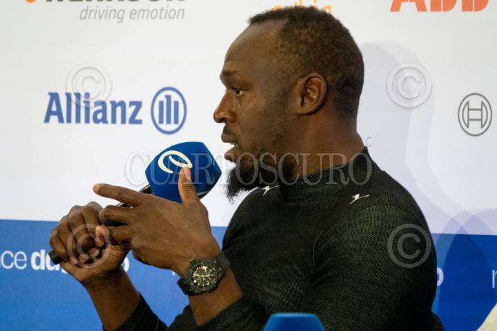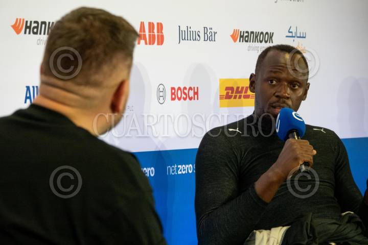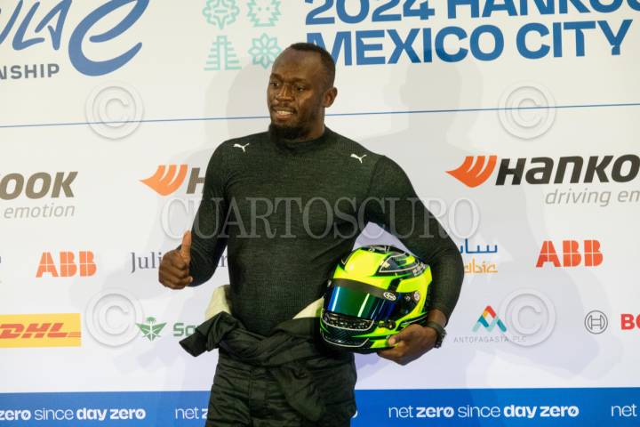 CIUDAD DE MÉXICO, 12ENERO2024.- El ex velocista y campeón olímpico en 100 metros planos, Usain Bolt, participó en una conferencia a medios durante el E-Prix de México de la Fórmula E en el autódromo Hermanos Rodríguez. FOTO: GALO CAÑAS/CUARTOSCURO.COM
