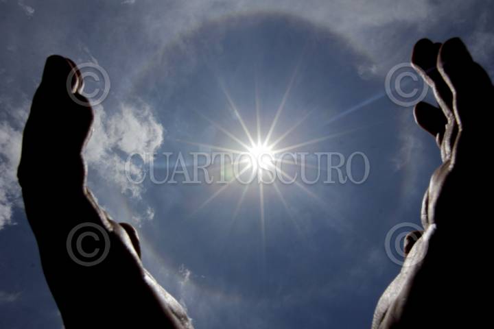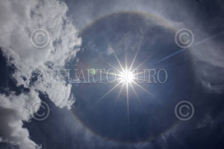 PUEBLA, PUE., 19ABRIL2014.- El efecto conocido como halo solar, se produce cuando rayos del sol atraviesan gotas de agua suspendidas en la atmósfera, refractándose y formando un aro parecido a un arcoirirs, este fenómeno visto desde abajo, se asemeja a una corona de colores alrededor del sol. FOTO: HILDA RÍOS/CUARTOSCURO.COM