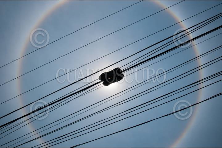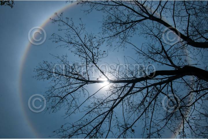 MÉXICO, D.F., 21MAYO2015.- Un halo de luz se formo alrededor del Sol durante varias horas del día, este fenómeno atmosférico, llamado Parhelio, es causado por partículas de hielo que refractan la luz, haciendo un espectro de colores alrededor del astro rey. FOTO: DIEGO SIMÓN SÁNCHEZ /CUARTOSCURO.COM