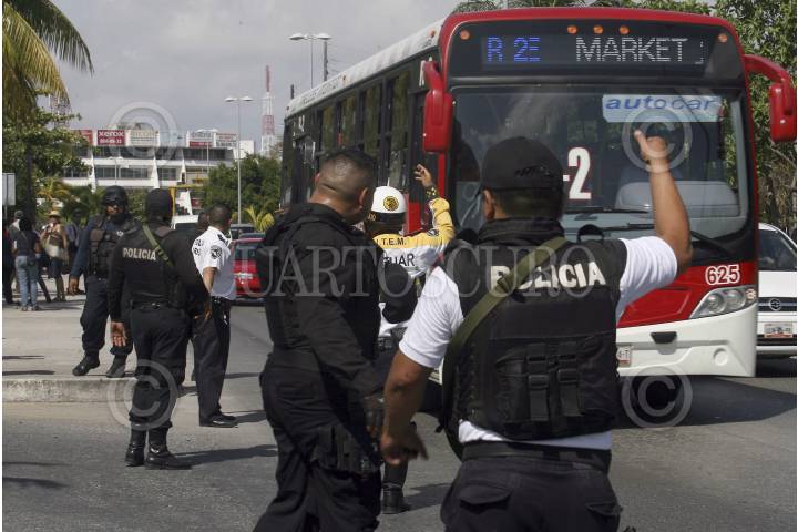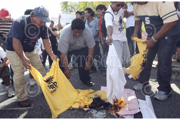 CANCÚN, QUINTANA ROO, 01ABRIL2013.- Un grupo de personas con pancartas y mantas en contra del aumento a la tarifa del transporte público y el alza de la gasolina cerraron parcialmente el acceso a la Zona Hotelera, impidiendo el paso a camiones provocando un gran congestionamiento vial. Algunos de los manifestantes que portaban camisetas amarillas y el logo del PRD coreaban consignas contra el Alcalde Julián Ricalde Magaña por supuestamente permitir el incremento al pasaje, aunque fue el Ayuntamiento de Benito Juárez el que, mediante una sesión extraordinaria de Cabildo, rechazó el aumento. Los supuestos perredistas no lo eran porque tras protestar contra el Alcalde con sus camisetas puestas, quemaron sus playeras en un alarde de rechazo al partido que gobierna la ciudad. FOTO: CSPHOTO /CUARTOSCURO.COM