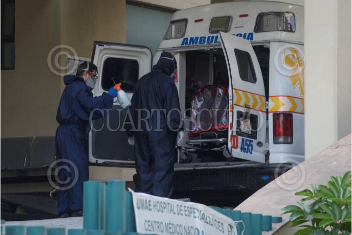Paramédicos se desinfectan después de haber realizado un ingreso de un paciente con covid-19 en Centro Médico Nacional Siglo XXI.