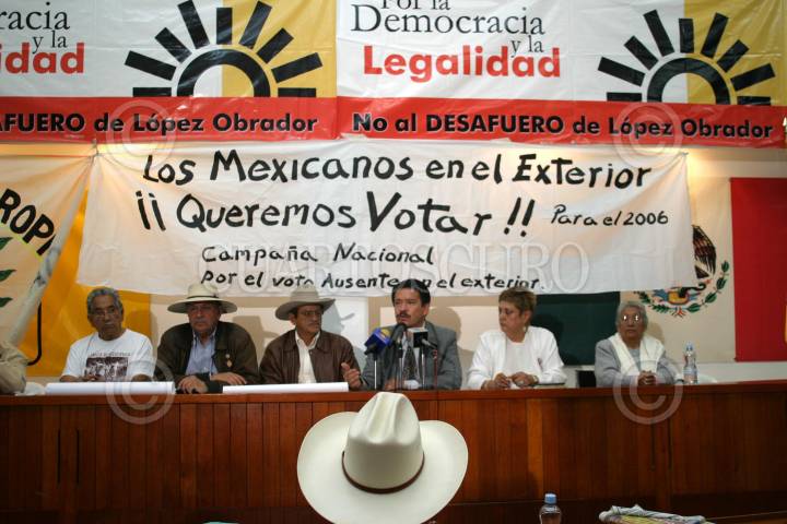 MEXICO, D.F. 28FEBRERO2005.- Al Rojas, David Silva coordinadores y representantes de las Organizaciones en el Extranjero, y Carlos Navarrete, Secretario General del PRD, presentaron la campaña nacional ¨Por el voto ausente en el exterior¨, en las instalaciones de dicho partido. FOTO: Sandra Perdomo/CUARTOSCURO.COM