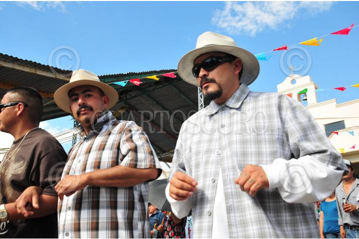 VILLA JIMENEZ, MICHOACAN, 15FEBRERO2010.- Migrantes michoacanos y con vestimenta tipo "cholo", durante la peregrinación de los hijos ausentes (peregrinación de migrantes mayormente radicalizados en California, Estados Unidos), que se ha vuelto una tradición que coincide con los festejos del santo patrono San Nicolás de Tolentino al igual que el Carnaval. FOTO:MARIA DI PAOLA BLUM/CUARTOSCURO.COM