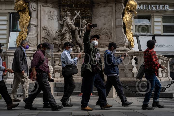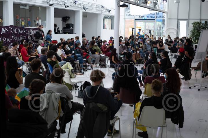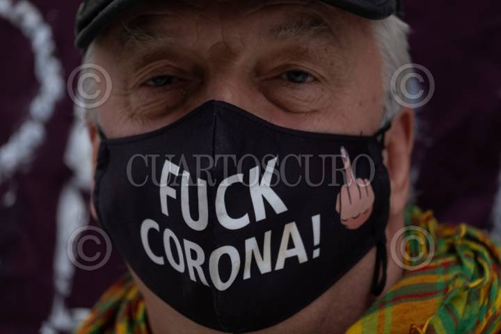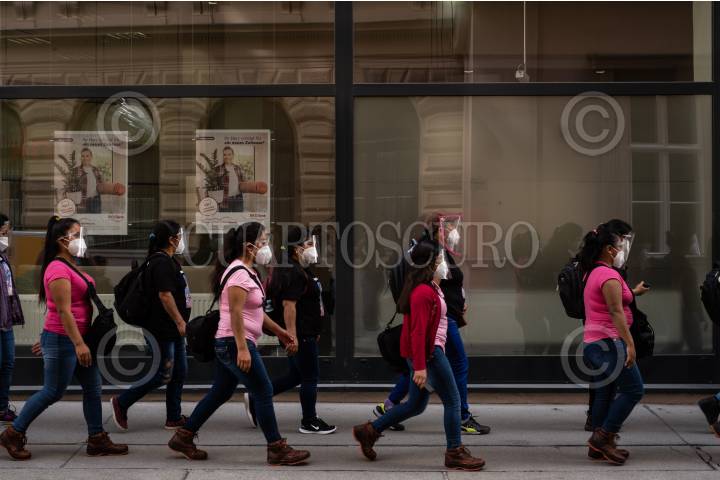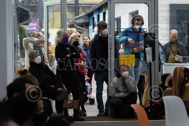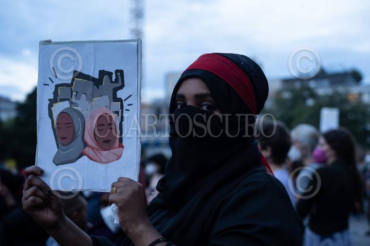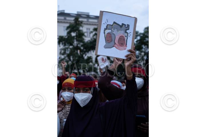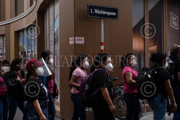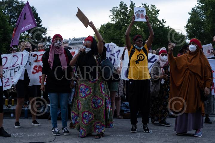 Protesta en la plaza pública Karls Platz por parte de mujeres de la comunidad somalí y colectivas feministas, en donde participaron mujeres de la Fuerza Aérea Zapatista del EZLN.