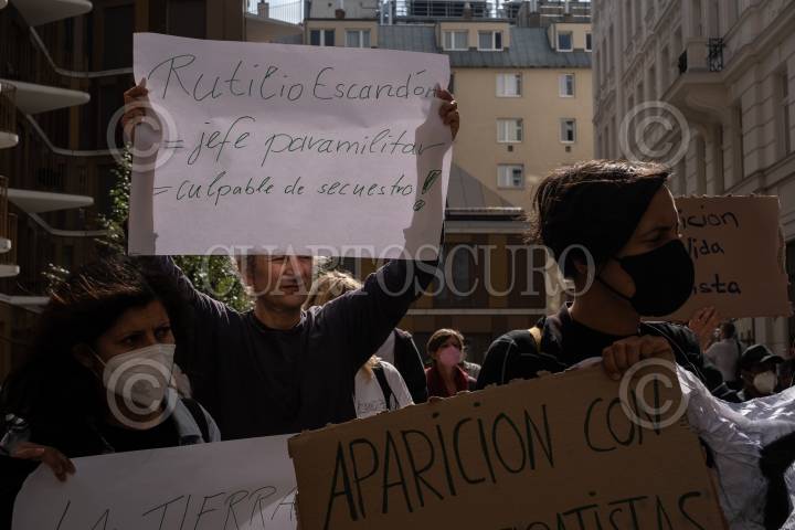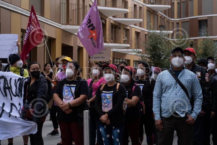 Manifestación frente a la embajada de México donde participaron zapatistas, exigiendo la presentación con vida de dos compañeros.