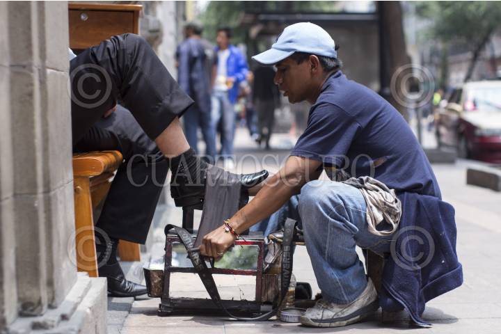 MEXICO, D.F., 22JUNIO2014.-Un bolero da los últimos toques al calzado de un empleado de un restaraunte de la Avenida Cinco de Mayo en el Centro Histórico de la Ciudad de México FOTO: DAVID POLO /CUARTOSCURO.COM