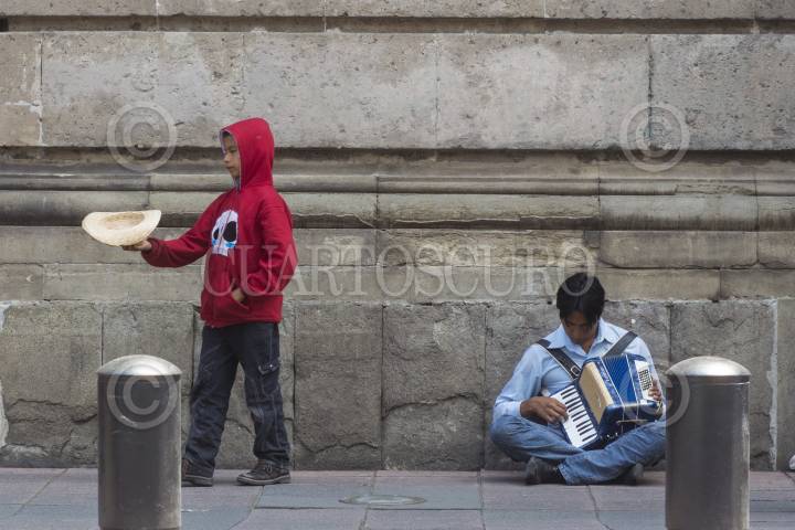 MEXICO, D.F., 23AGOSTO2014.- Un viejo acordeón es la herramienta que le brinda posibilidades de salir adelante a un hombre y a su hijo, quienes interpretan sus piezas en las calles del Centro Histórico a cambio de algunas monedas de los transeúntes que, a veces sin prestar atención, pasan por ahí. FOTO: DAVID POLO /CUARTOSCURO.COM